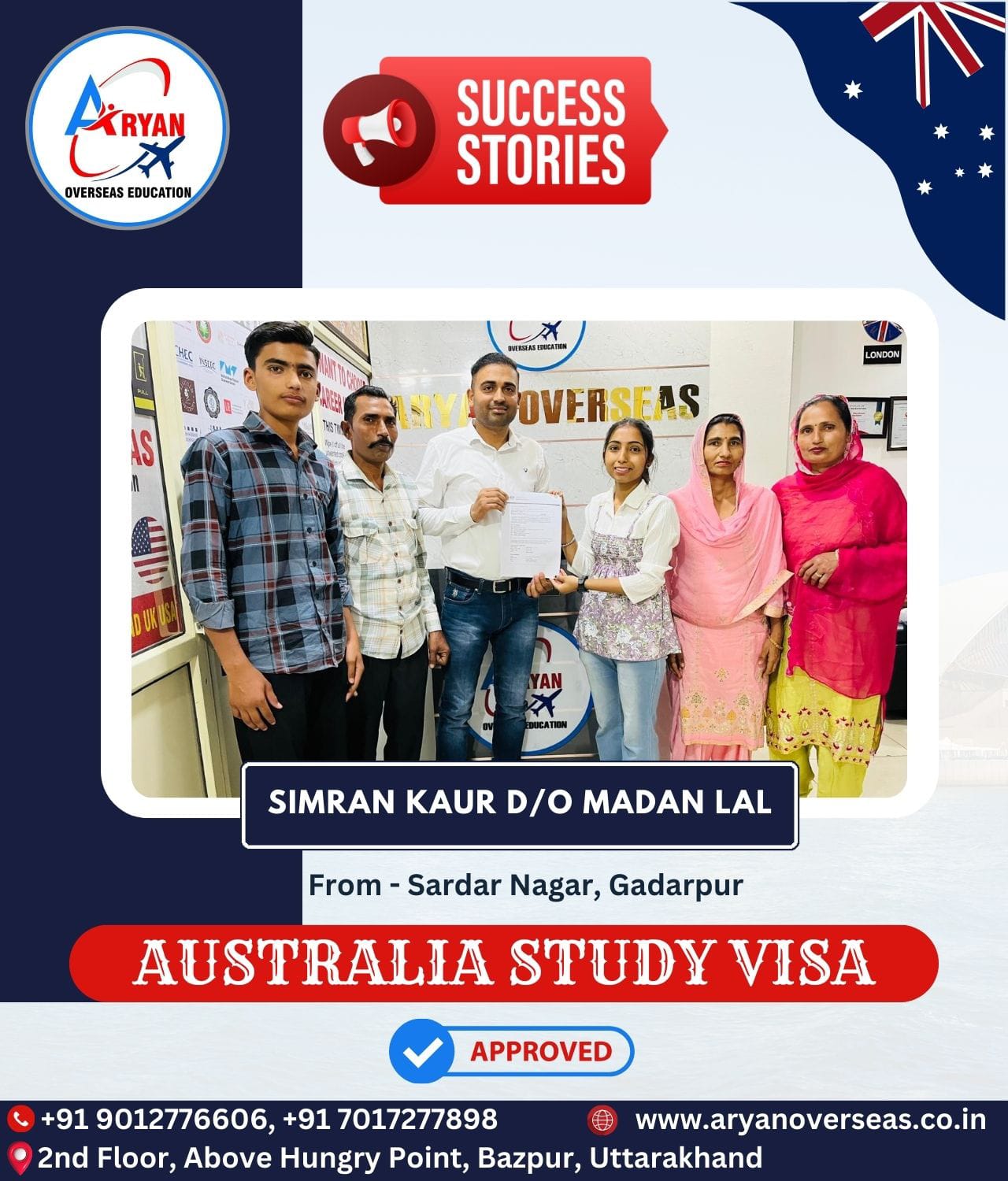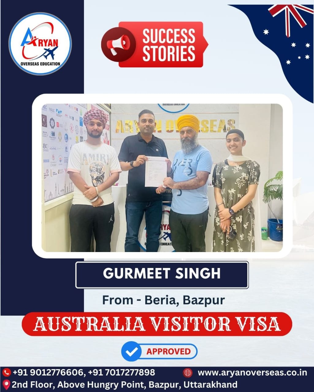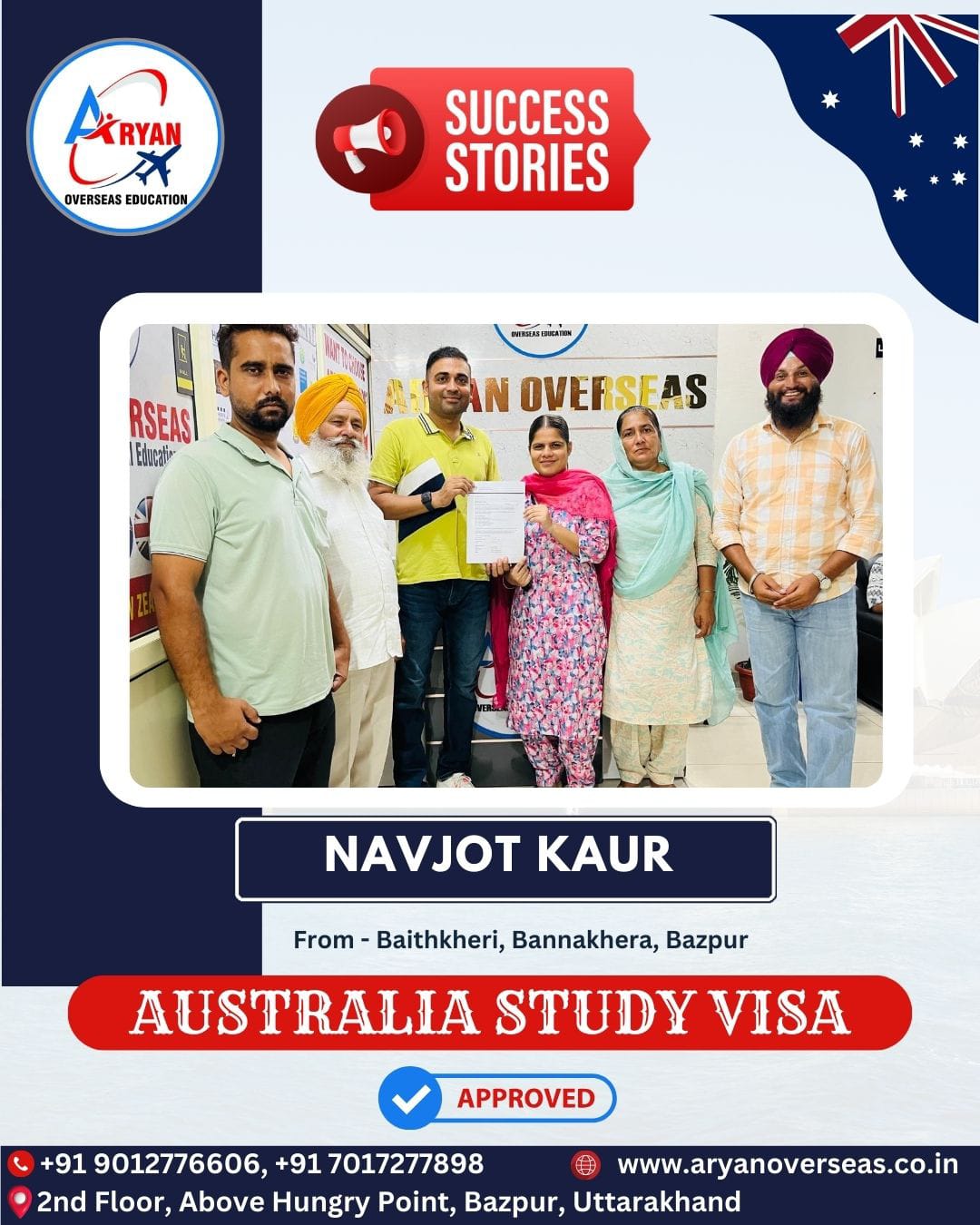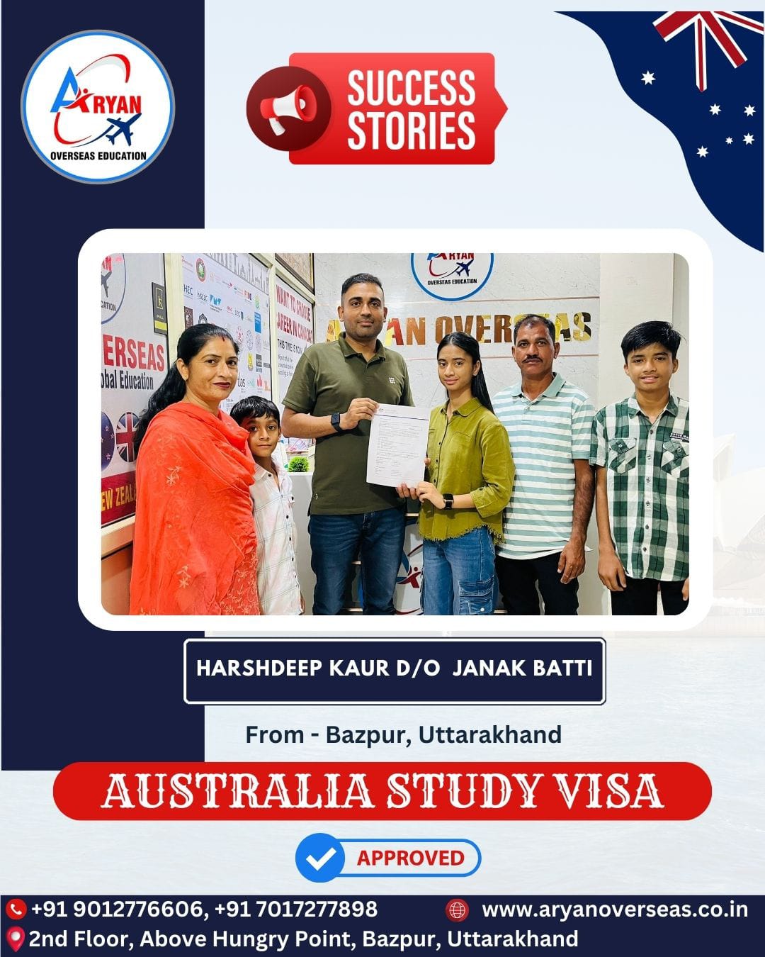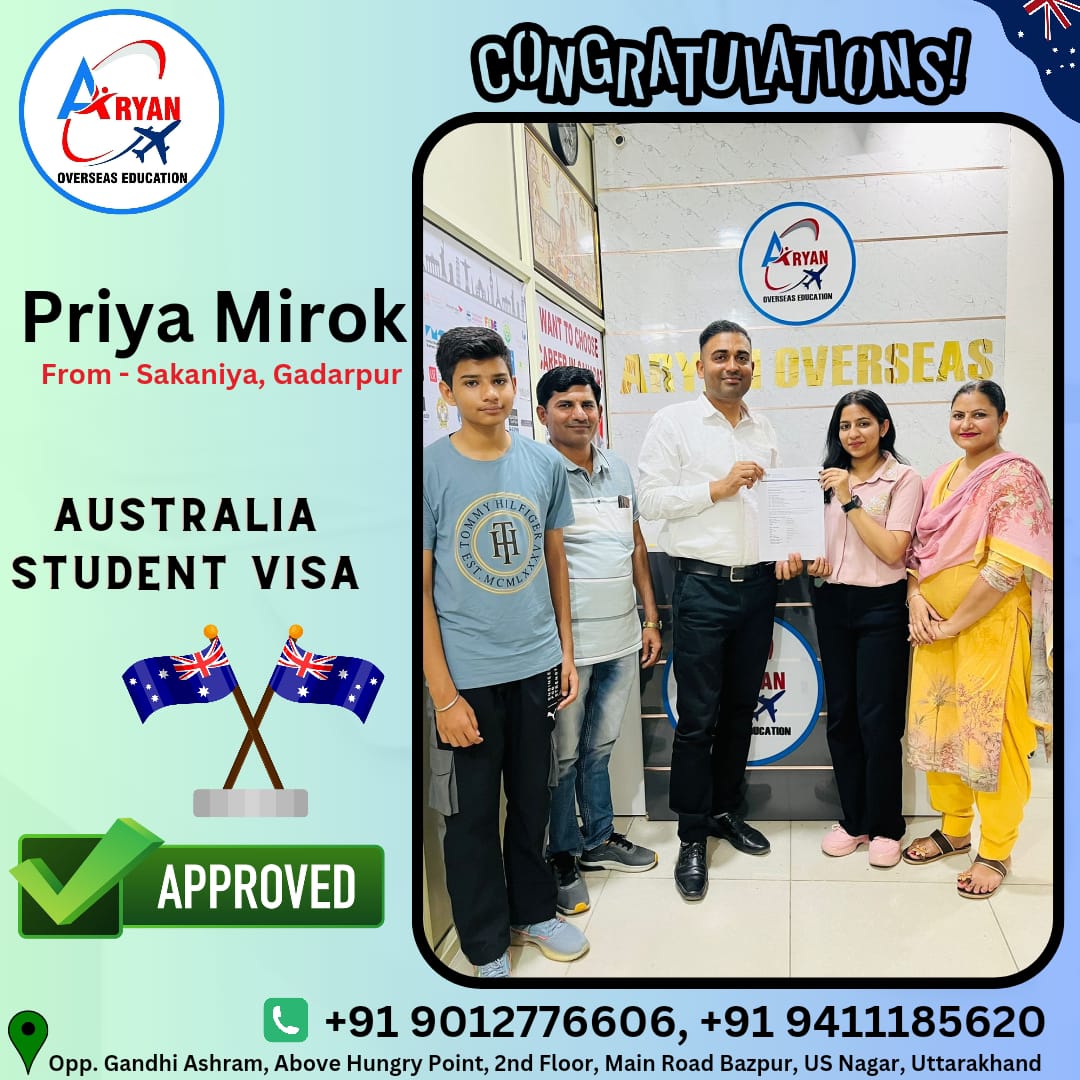 I GOT MY AUSTRALIAN STUDY VISA WITH THE HELP OF ARYAN OVERSEAS AND I REALLY APPRICIATE HARD WORK DONE BY TEAM ARYAN OVERSEAS
