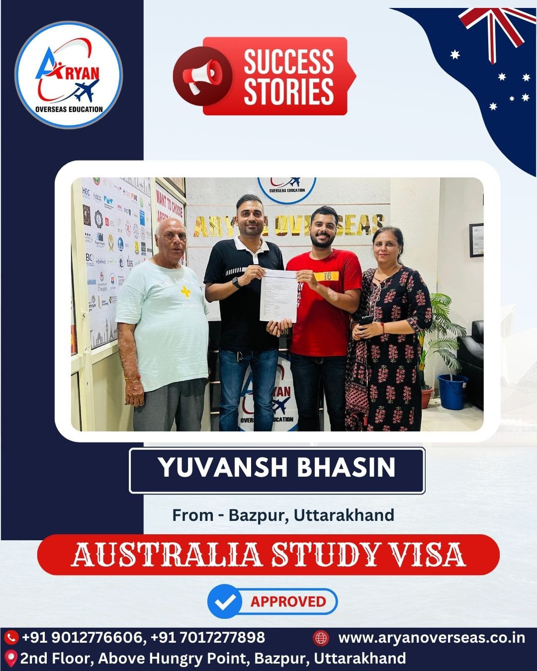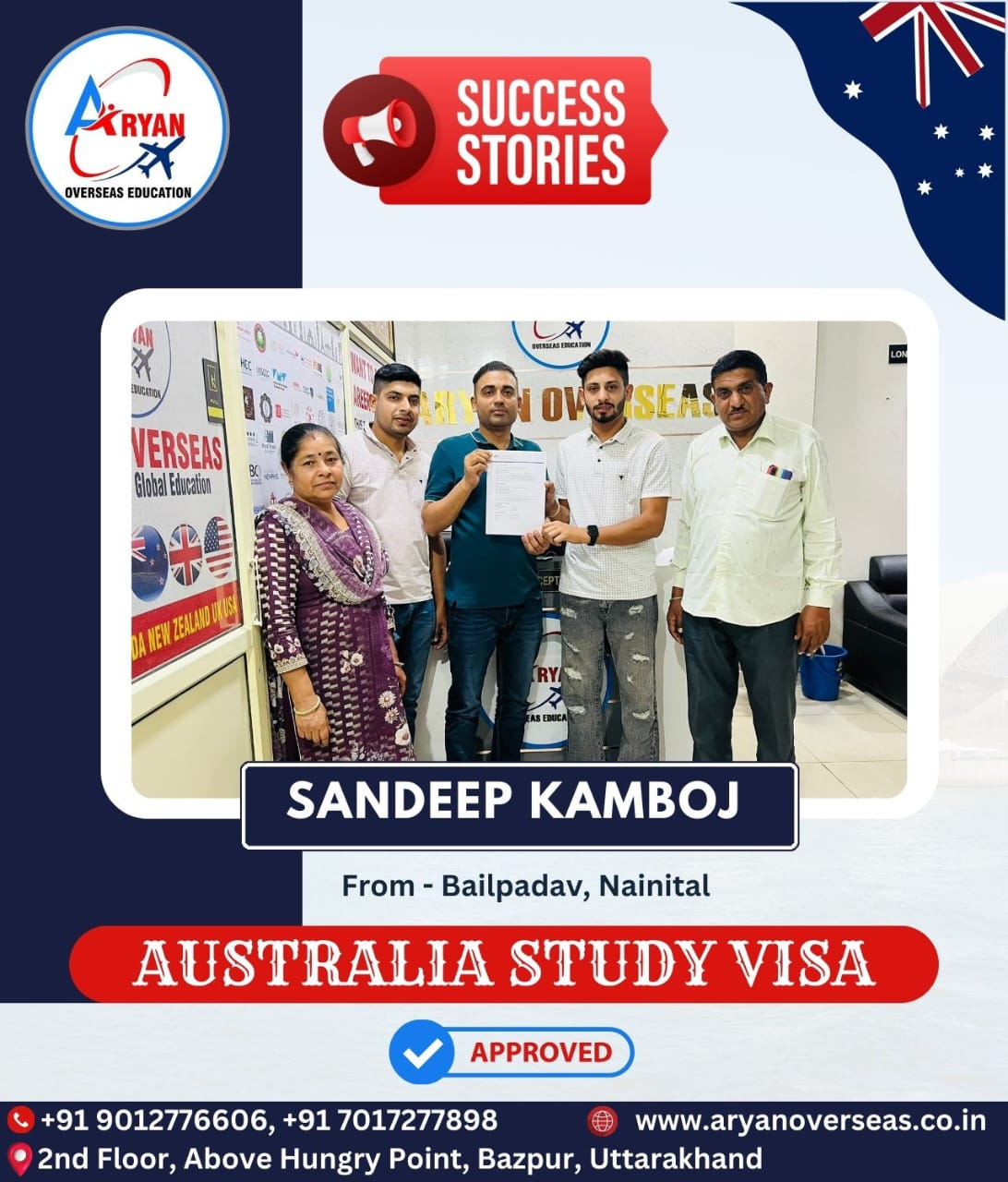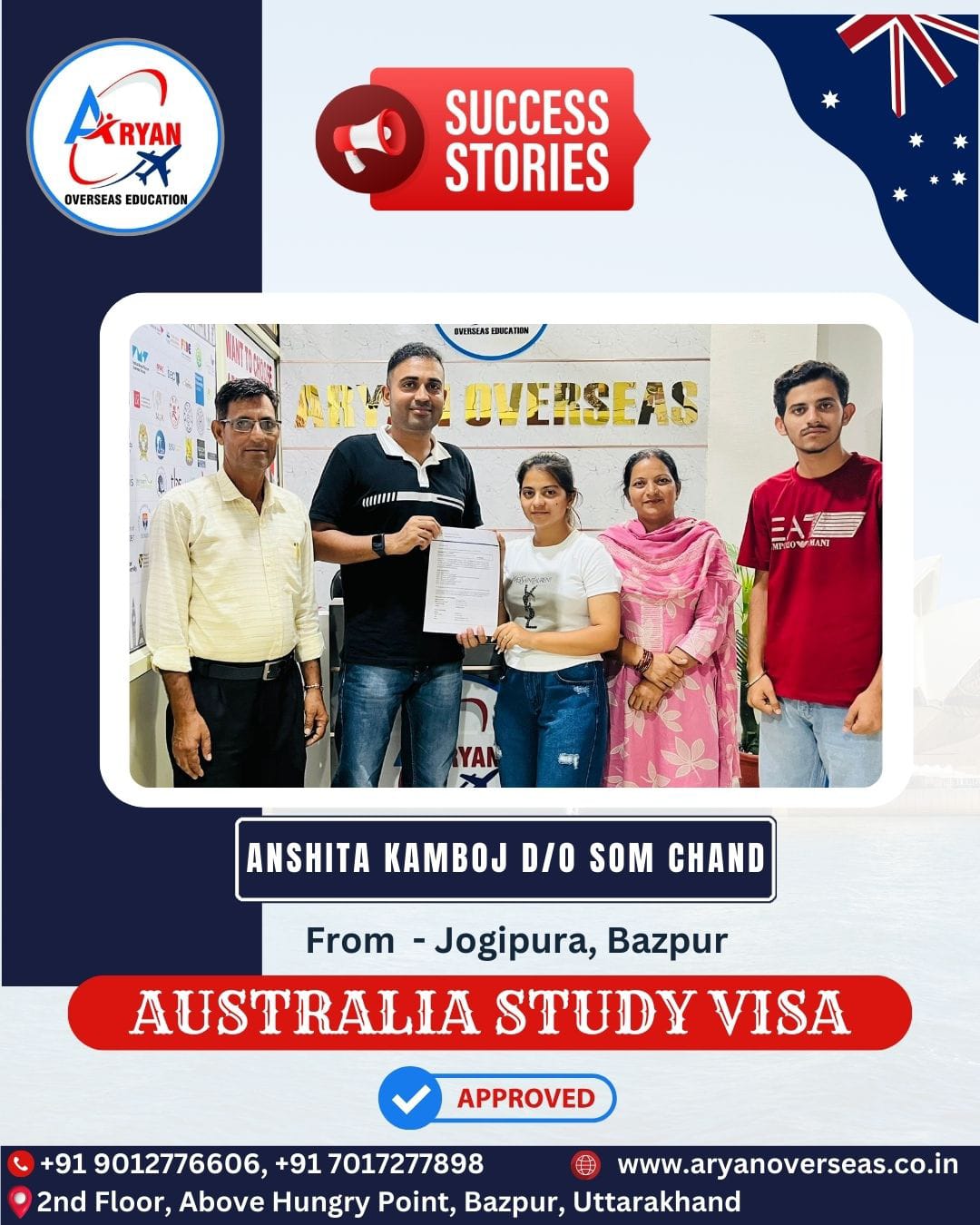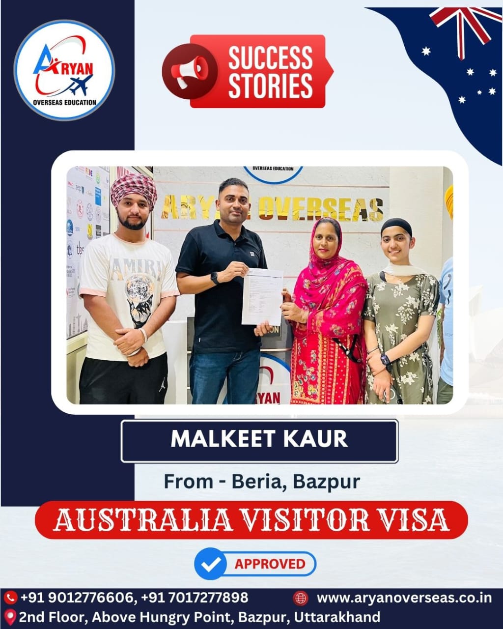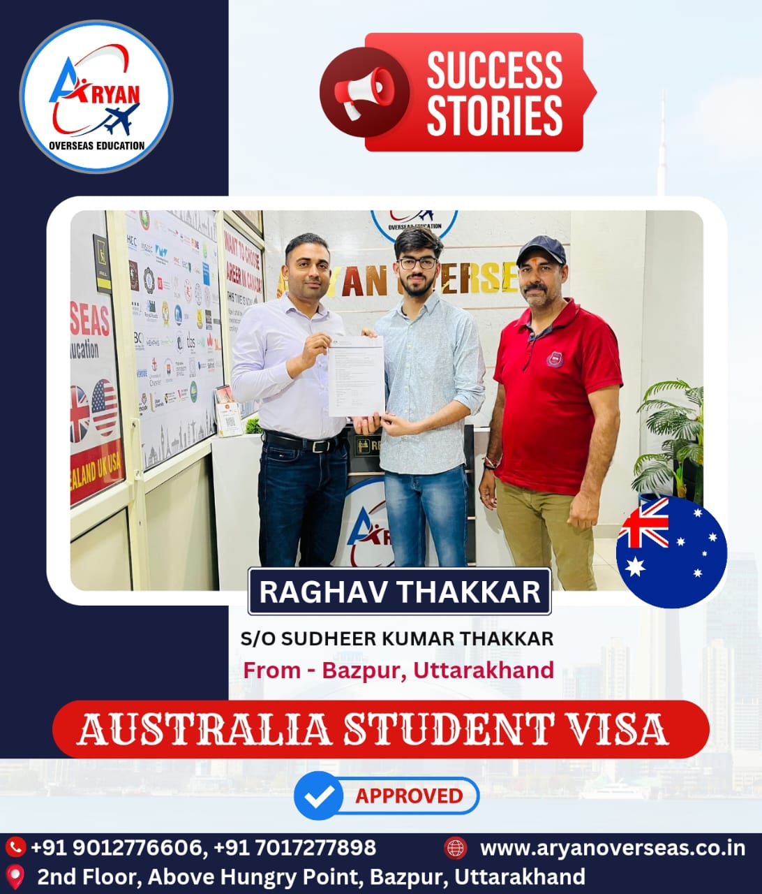 I GOT MY AUSTRALIAN STUDY VISA WITH THE HELP OF ARYAN OVERSEAS AND I REALLY APPRICIATE HARD WORK DONE BY TEAM ARYAN OVERSEAS