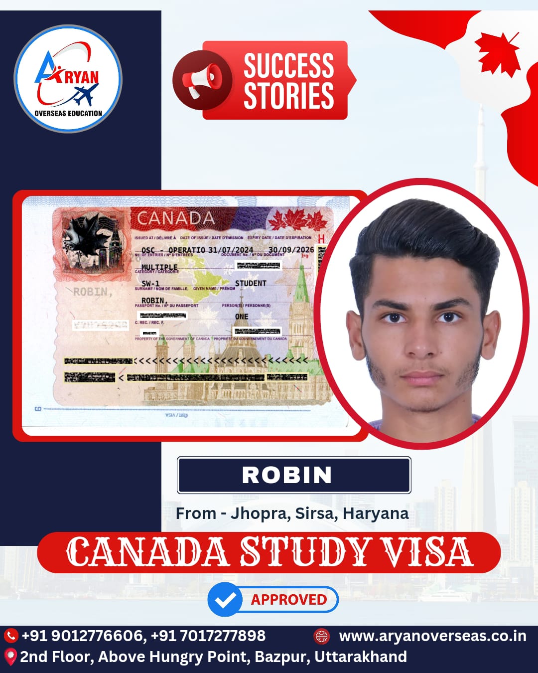 Five minutes after meeting Mr. Robin, I knew I had made a wise decision. I got my canadian study visa within 1 month. I do not hesitate to recommend Aryan Overseas.